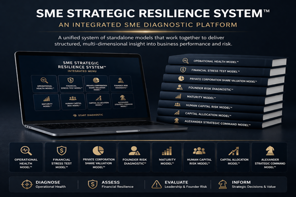 It brings together your core SME diagnostic models into one structured framework so you can evaluate business performance across operational, human capital, financial, and risk dimensions from a single system.